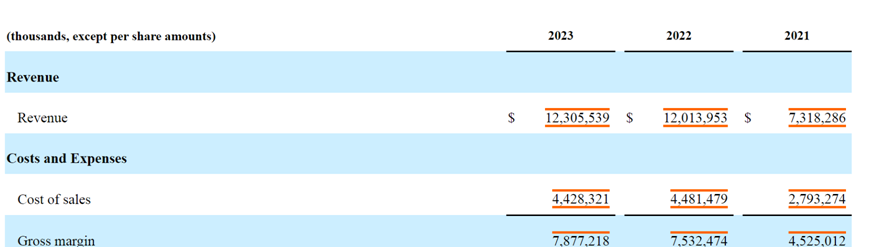2023、2022及2021財年毛利分別為78.8億美元、75.3億美元及45.3億美元。